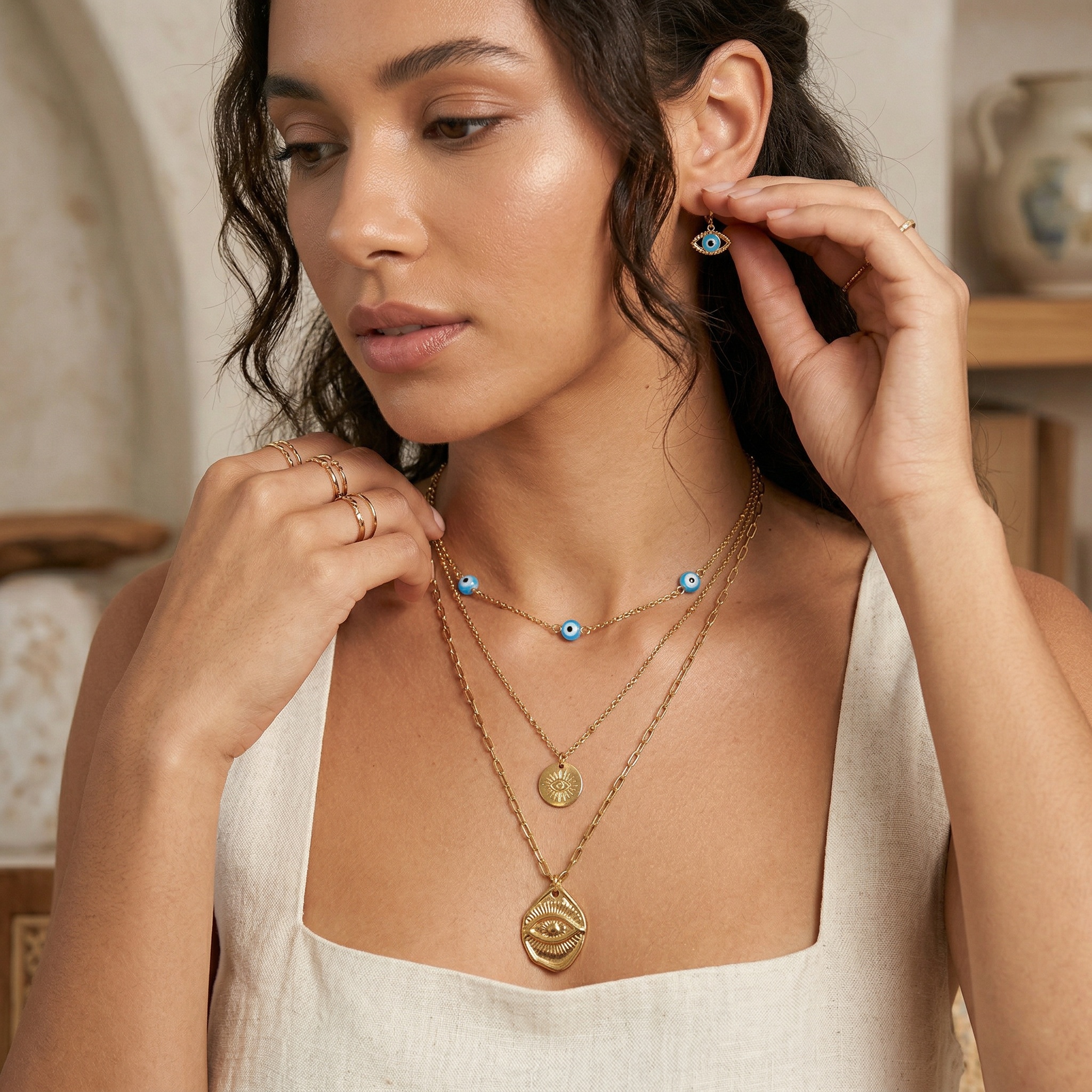 Ατσάλινο κολιέ τρίσειρο με ματι