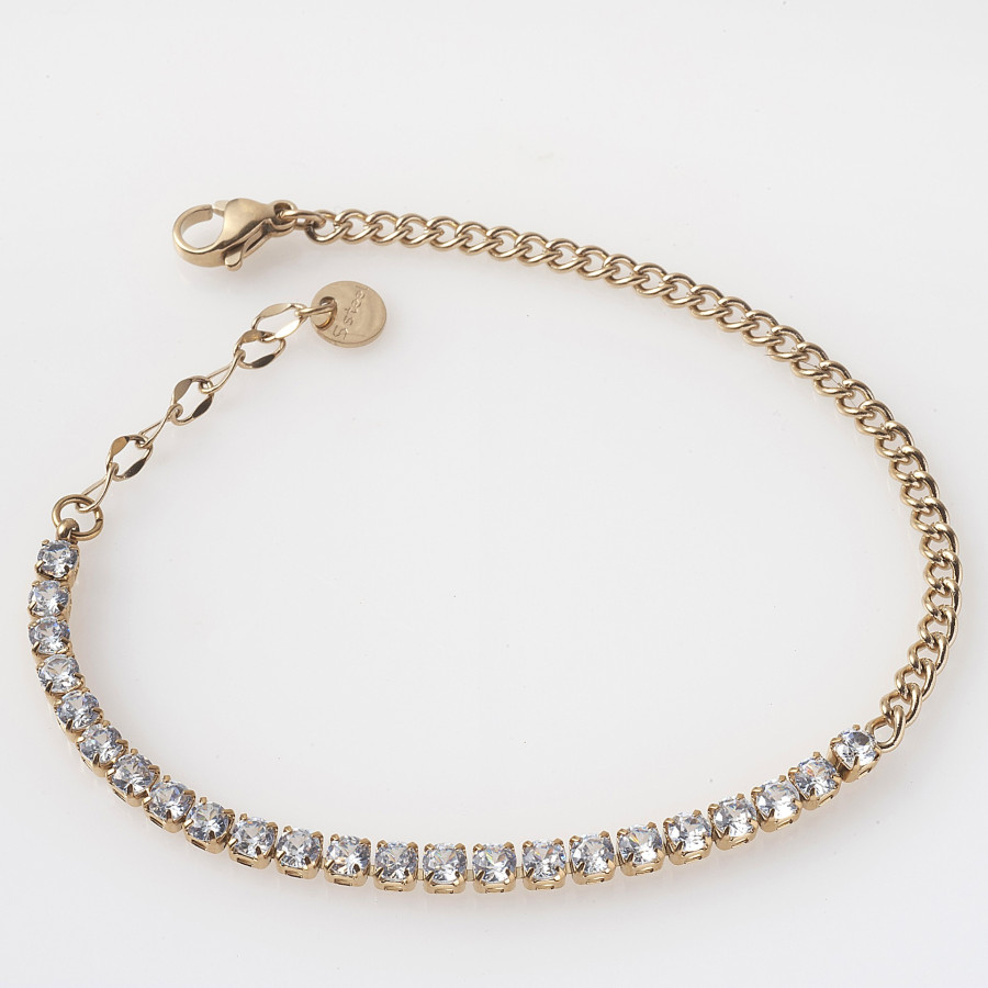 Χειροποίητο βραχιόλι από ατσάλι 316′ με κρύσταλλα και επιμετάλλωση σε πραγματικό χρυσό 18Κ. Μήκος 15εκ + 5εκ επέκταση. Υποαλλεργικό (nickel free). Χωρίς μόλυβδο και κάδμιο.
