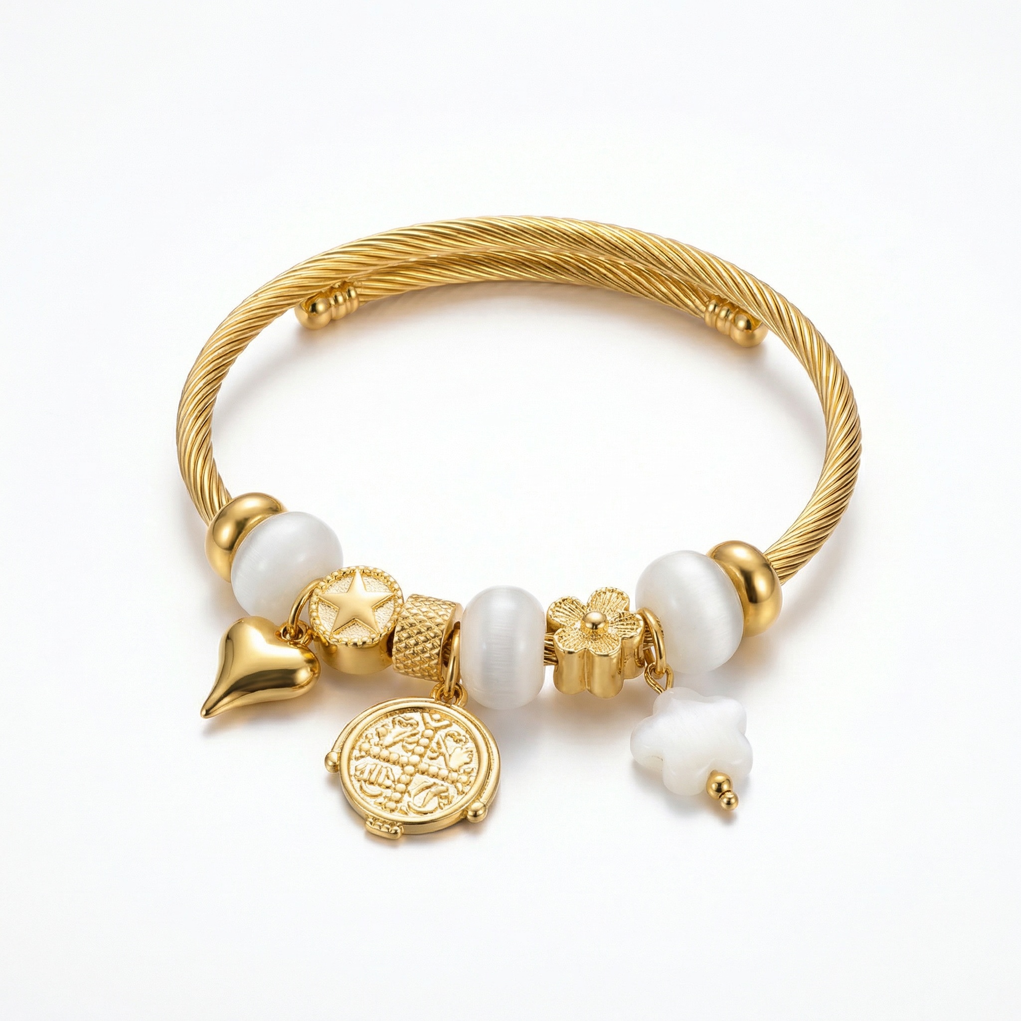 Κομψό επιχρυσωμένο βραχιόλι τύπου Pandora από ανοξείδωτο ατσάλι με επιχρυσωμένα στοιχεία και λευκές πέτρες. Ρομαντική καρδιά και διακοσμητικά charms ολοκληρώνουν το σχέδιο. Elegant επιλογή για κάθε περίσταση.