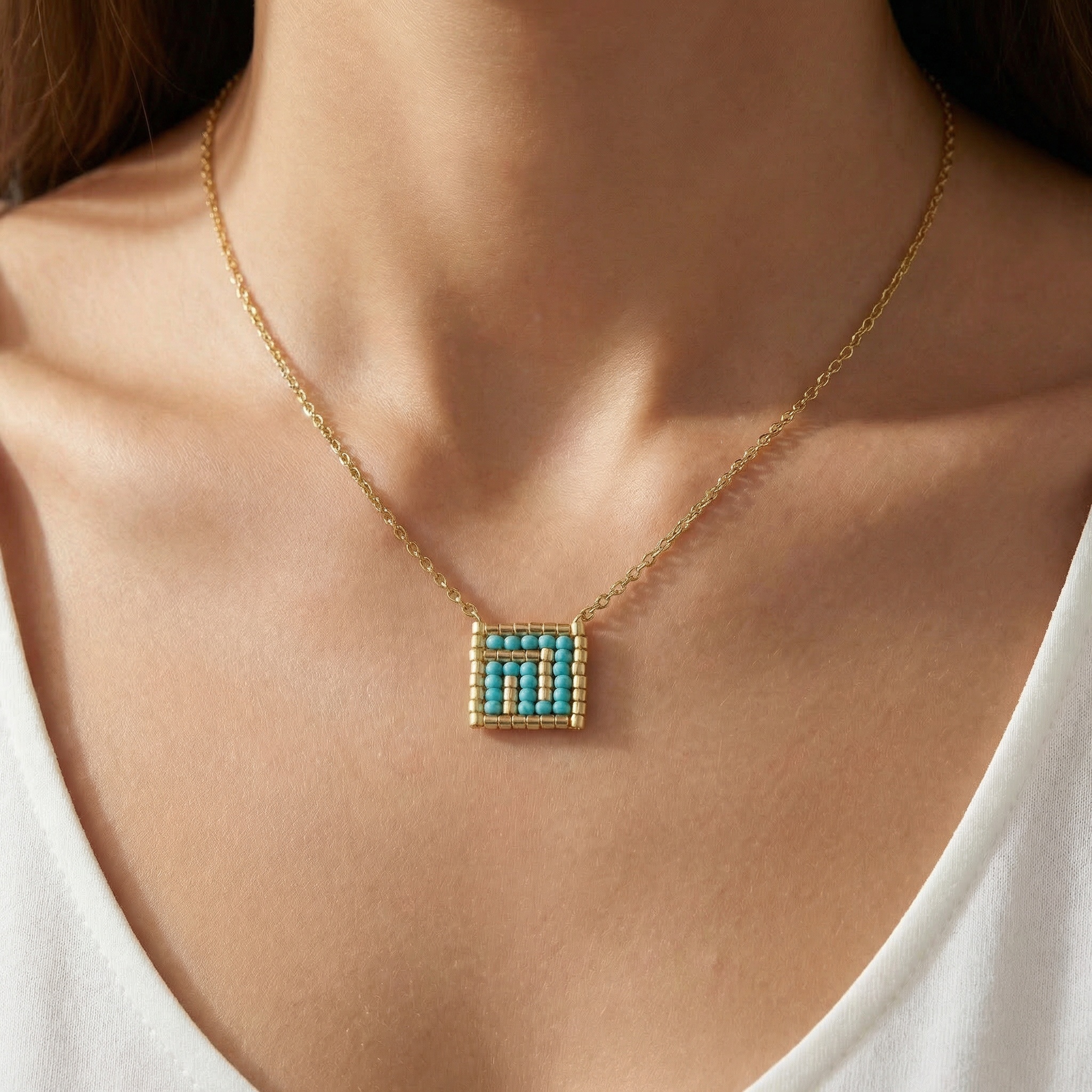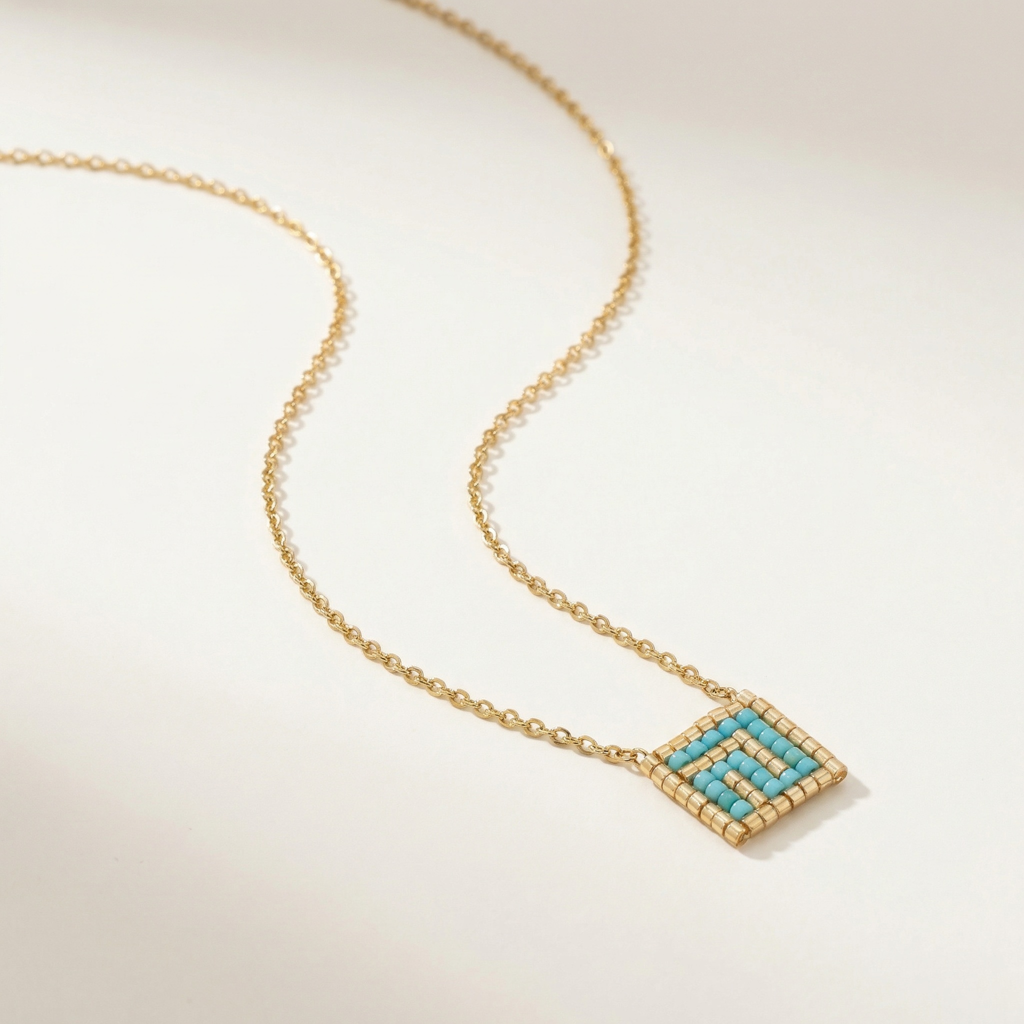 Τετράγωνο πλεκτό μοτίφ σε γαλάζιες και χρυσές αποχρώσεις τύπου Miyuki που θυμίζουν καλοκαιρινό φως και θάλασσα. Φρέσκο, φωτεινό και ιδανικό για να δώσει χρώμα σε κάθε outfit.