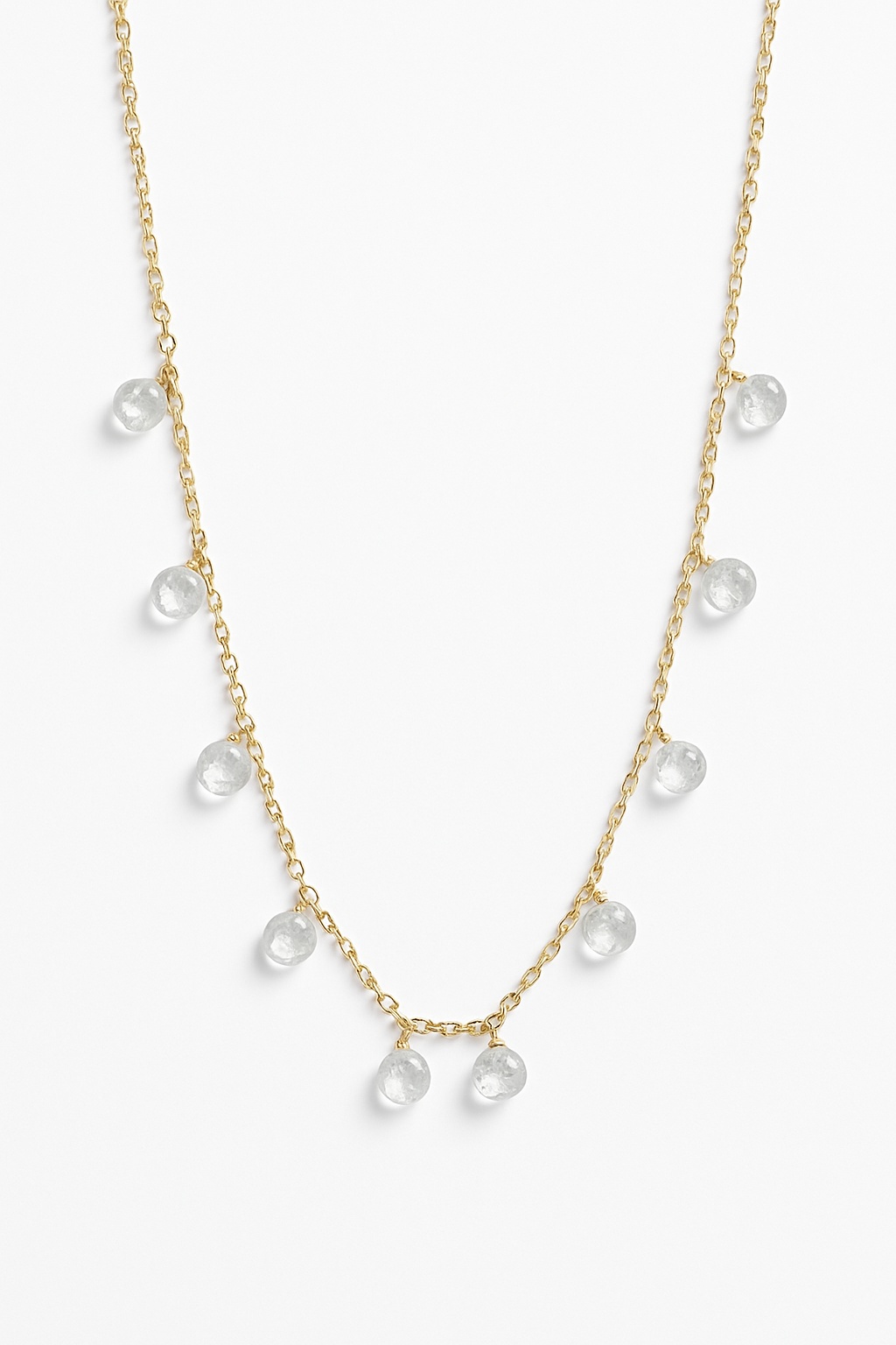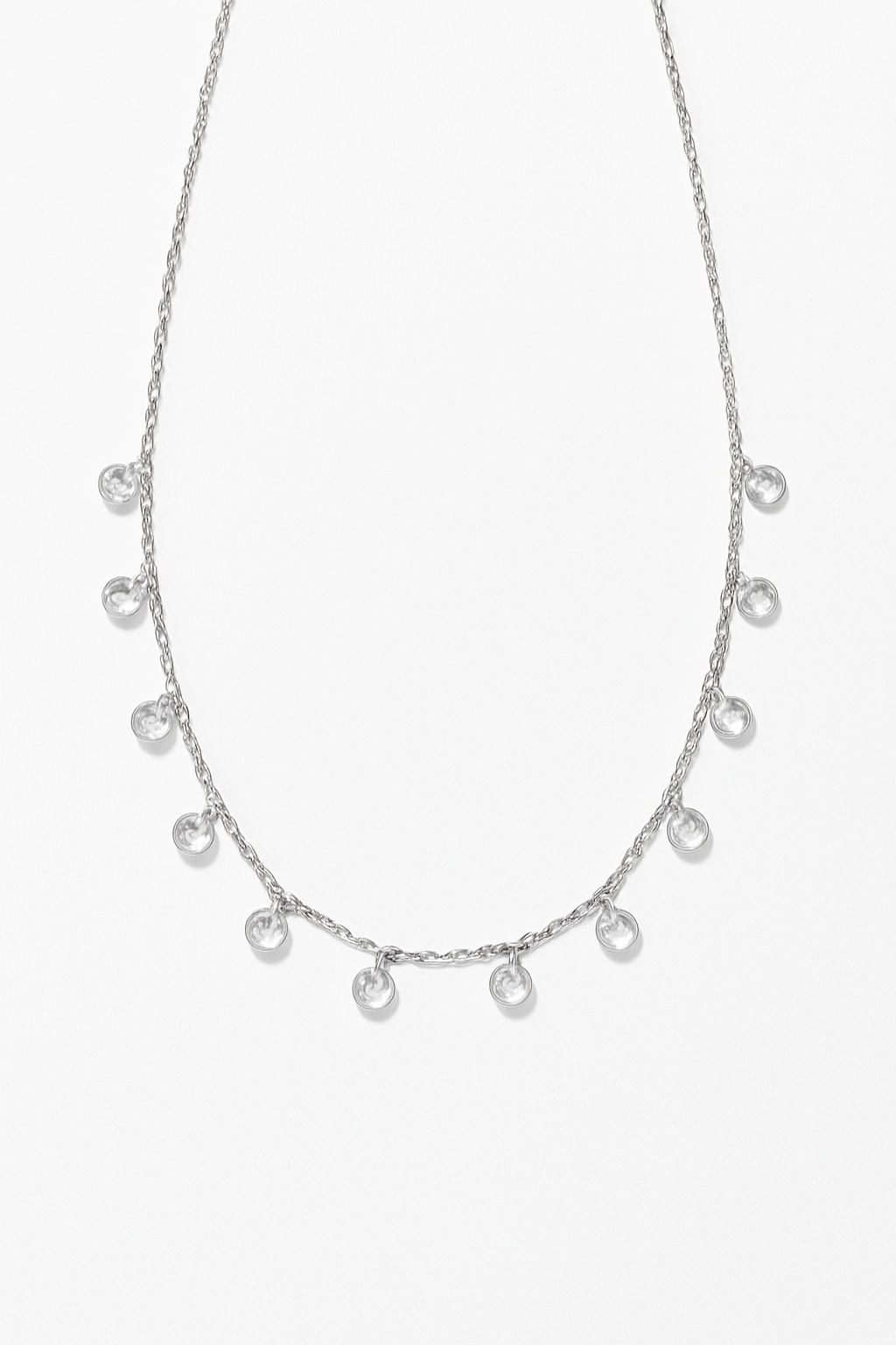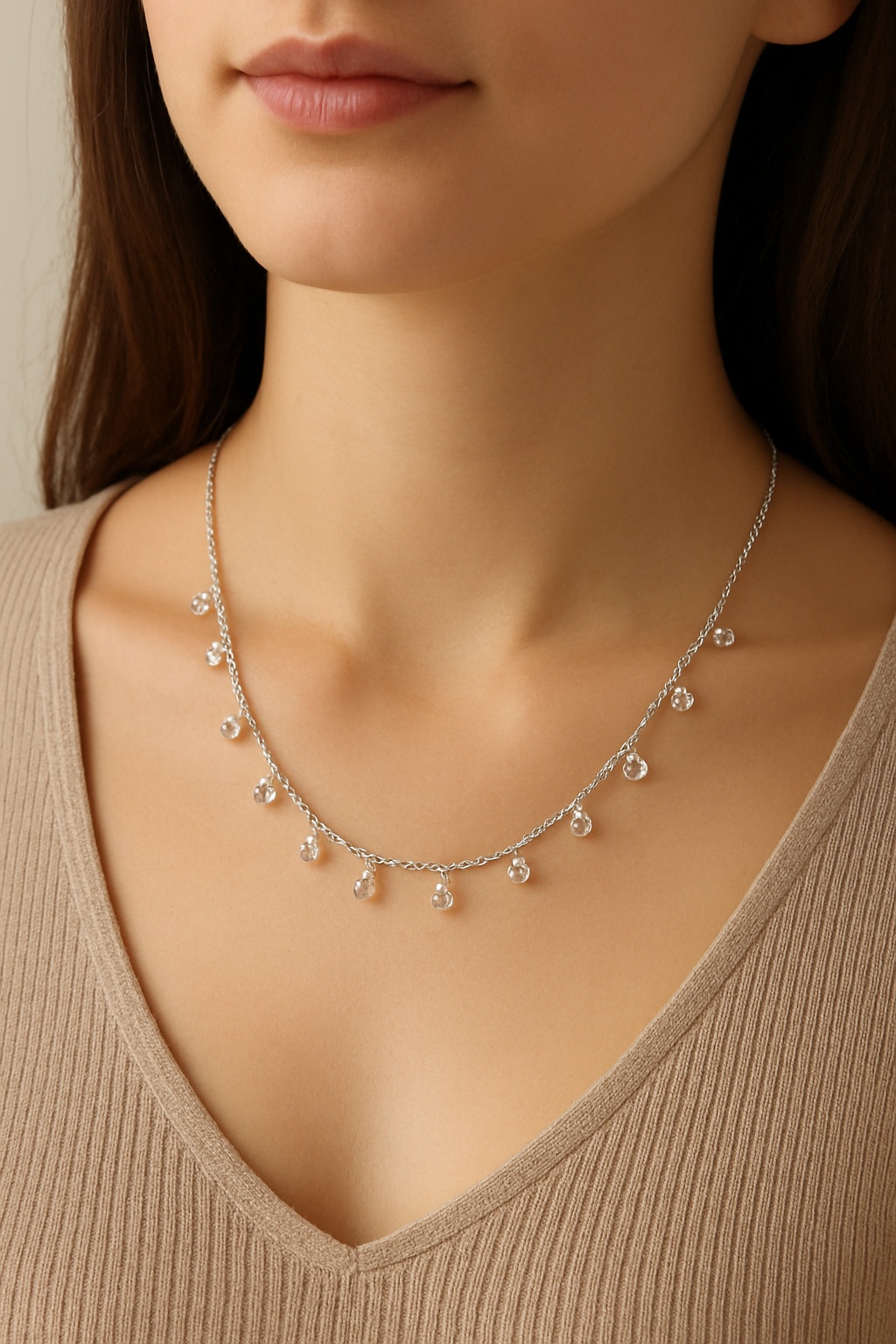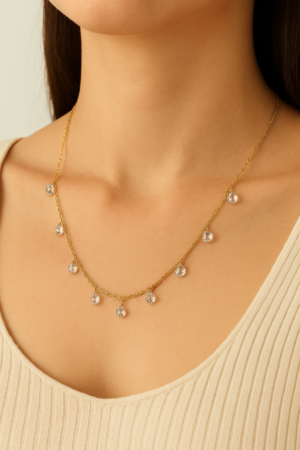 Χρυσό και ασημί κολιέ με Κρεμαστά Κρύσταλλα. Ένα λαμπερό και θηλυκό κολιέ σε χρυσή απόχρωση, διακοσμημένο με μικρές, κρεμαστές κρυστάλλινες χάντρες που αντανακλούν διακριτικά το φως σε κάθε κίνηση. Ο κομψός και αέρινος σχεδιασμός του χαρίζει μία ρομαντική πινελιά, ιδανική για καθημερινές εμφανίσεις.