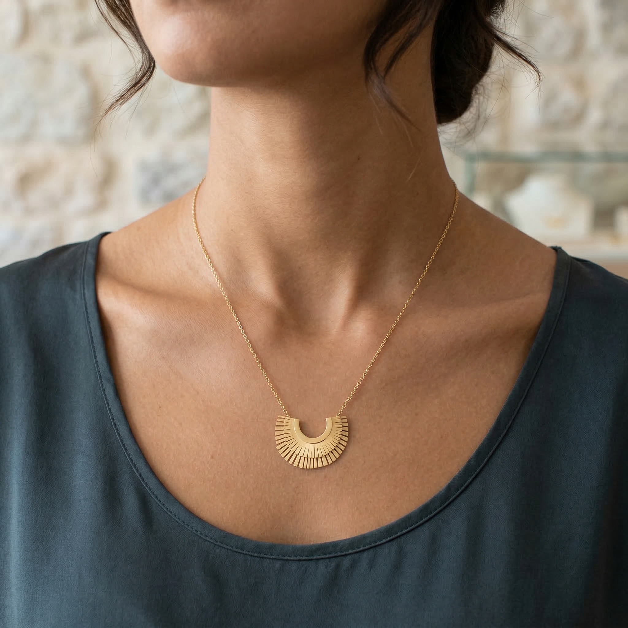 Σύγχρονο και κομψό κολιέ από ανοξείδωτο ατσάλι, με κεντρικό ημικυκλικό μοτίφ και διακριτικές λεπτομέρειες που του χαρίζουν ιδιαίτερο χαρακτήρα. Διαθέσιμο σε χρυσό και ρόδιο, είναι ιδανικό για να αναβαθμίσει ένα minimal outfit ή να φορεθεί ως statement κομμάτι σε βραδινές εμφανίσεις. Το ανθεκτικό του υλικό εξασφαλίζει ότι παραμένει λαμπερό και αναλλοίωτο στον χρόνο.
