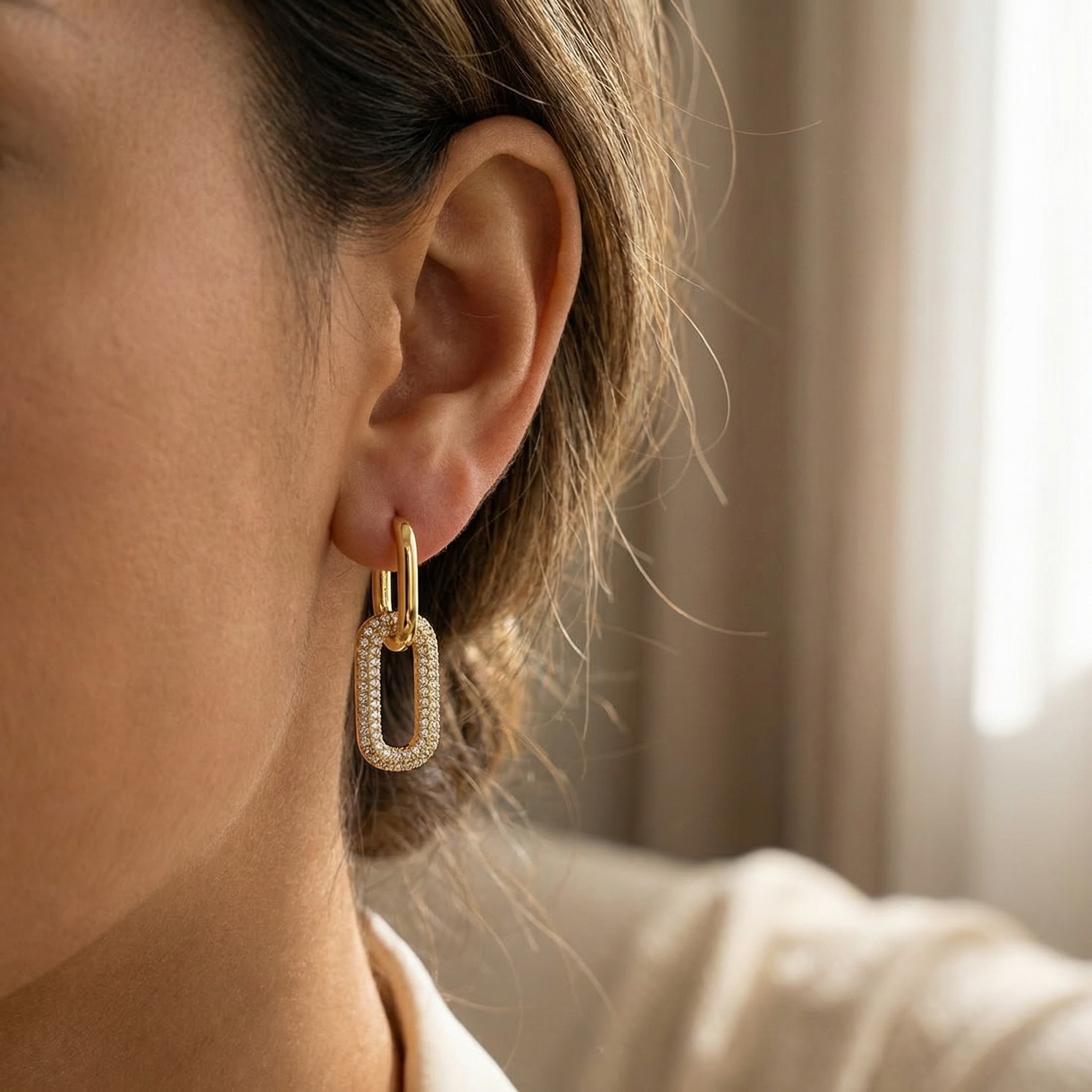 Σκουλαρίκια από ανοξείδωτο ατσάλι σε χρυσαφί απόχρωση, με οβάλ κρίκο διακοσμημένο με strass. Minimal αλλά εντυπωσιακά, προσφέρουν λάμψη και κομψότητα σε κάθε look.Ιδανική επιλογή για chic εμφανίσεις, από casual έως βραδινέ