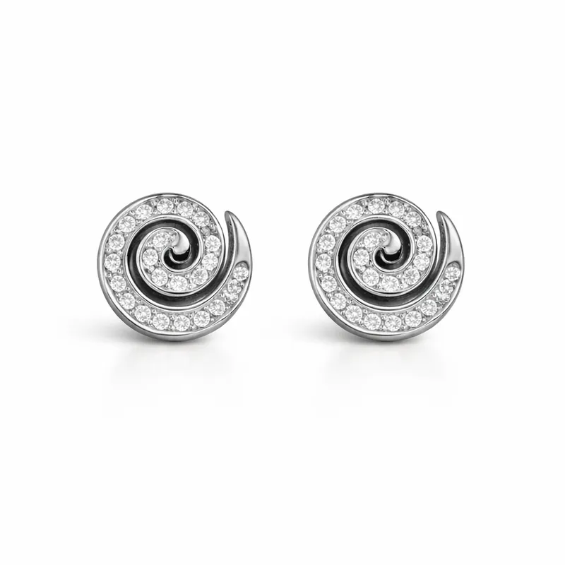Κομψά σκουλαρίκια από ανοξείδωτο ατσάλι σε ασημί απόχρωση, με σπειροειδές σχέδιο και λεπτομέρειες strass. Μικρά και διακριτικά, προσθέτουν λάμψη χωρίς υπερβολή και φοριούνται εύκολα στην καθημερινότητα.